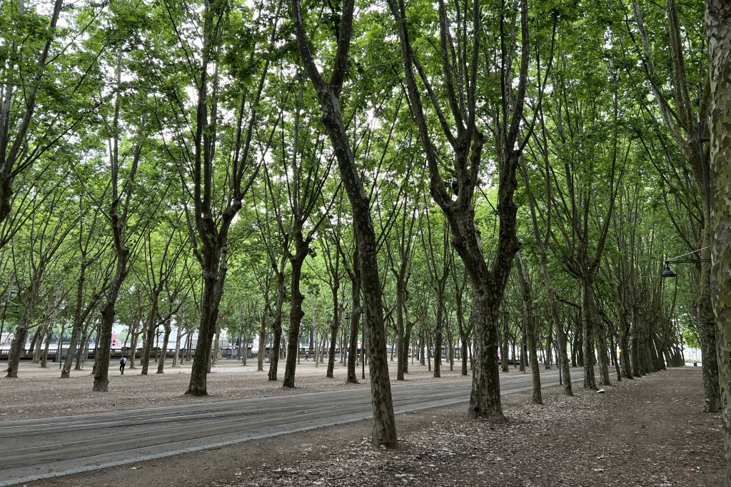 Et voilà que les bignones grimpantes sont en fleurs, une multitude de clochettes rouge orangé se détache du vert feuillage. Il a beaucoup plu cette nuit. L’air s’est un peu adouci et une couverture nuageuse enrobe la ville. Je n’ai pas croisé le petit homme à la casquette blanche cette semaine et dans le tram la fille au sac jaune de cet hiver ne semble plus voyager. Je repère toutefois un homme d’un âge avancé, barbe de quelques jours et cheveux poivre et sel attachés par un catogan, lunettes de vue monture métal, pantalon et chaussures de chantier. Dans les rues, les tilleuls fleurissent. Le tram contourne le Monument des Girondins et de part et d’autre de l’esplanade des Quinconces les platanes veillent.