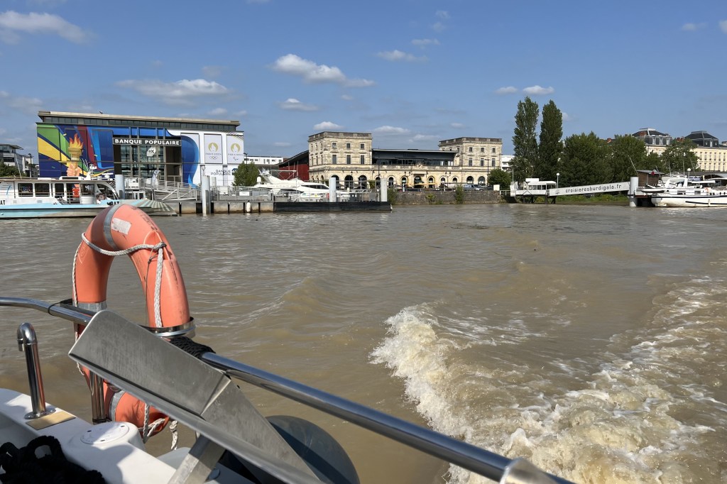 Sur le miroir d’eau, vapeur rafraichissante alterne avec fine nappe d’eau dans laquelle les grands comme les petits pataugent avec ivresse. Un vent d’orage souffle subitement sur les quais alors que des employés municipaux montent les baraquements de Bordeaux fête le vin. On n’a déjà plus accès aux jardins et des petits couloirs permettent aux curieux de se rapprocher encore pour quelques jours d’une partie des quais.