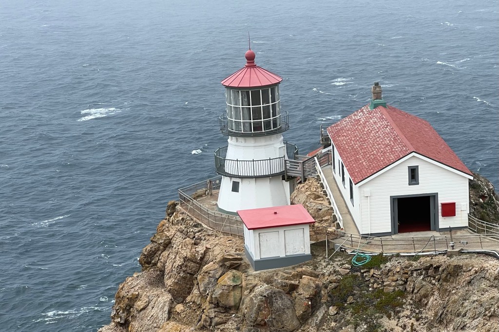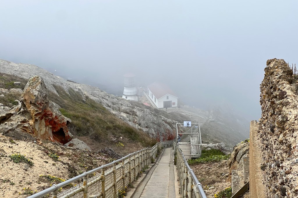 Quand on arrive aux abords du phare, il est dans la brume, le vent souffle fort. Il faudra descendre 313 marches pour en faire le tour et 313 pour remonter au parking, logique. Puis il y a cette femme qui en me croisant prend le temps de faire une halte et de m’expliquer comment aborder les marches pour faire travailler un maximum de muscles. Étonnant ! On reprend la route dans l’autre sens pour récupérer la route 1, l’esprit essoré par les rafales de vent. Plusieurs corps de ferme bordent la route. Parfois, la nouvelle habitation côtoie l’ancienne, encore debout malgré l’état de délabrement avancé. Dans un coin derrière une grange, un vieux break Ford rouillé, des tracteurs hors d’usage. Le temps de faire un stop à Pont Reyes, je rentre dans une librairie. Des œuvres d’Annie Ernaux sont mises en avant à côté des deux prix Pulitzer de fiction de cette année. Dehors, un homme cheveux longs peu entretenus, barbe hirsute et pieds nus, chante, danse en remontant la rue principale croisant le regard désemparé des promeneurs.
