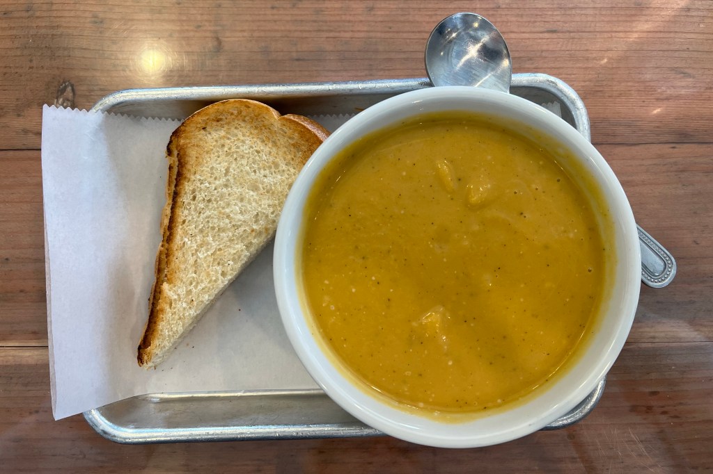 Mendocino. On décide de faire une halte, marcher un peu dans les rues, sentir l’âme de cet emplacement, prendre quelques photos des maisons, écouter les promeneurs, déjeuner au GoodLife Cafe & Bakery et commander une soupe du jour, tomatoes ou butternut, un régal. On est arrivé peu de temps avant la fermeture. À la table à côté de nous, deux femmes bavardaient très fort, terminaient leur soupe, on pouvait suivre leur conversation quelque peu futile, des choses et autre de la vie, des virées à San Francisco, des hommes croisés à certains moments de leur vie, les voisins trop présents. Aujourd’hui , elles ont certainement fait la fermeture de l’établissement.
