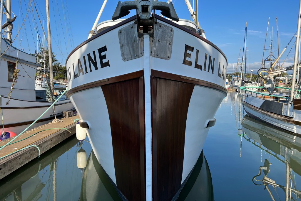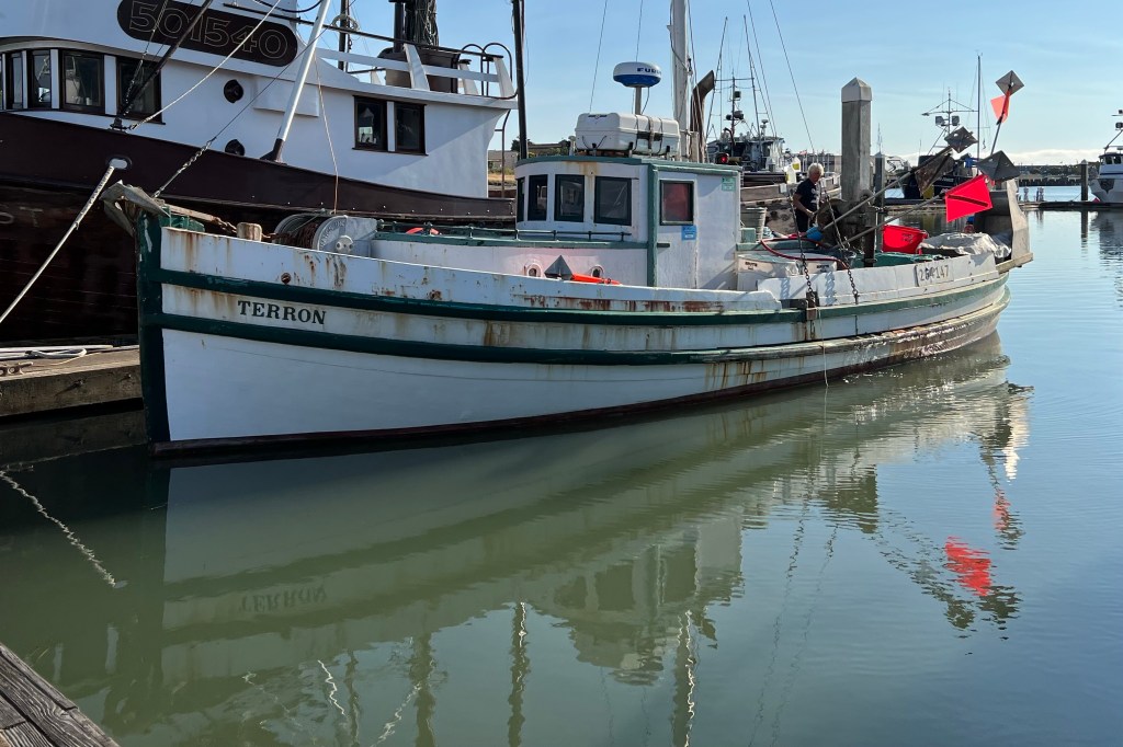 Ce soir, dans le port de pêche d’Eurêka il faisait bon, la brume s’était retirée au loin sur l’eau et le soleil brillait. Le Terron, petit bateau de pêche s’apprêtait à appareiller. Sur le ponton, j’ai croisé l’un des deux marins, nous avons échangé des banalités. Je ne saurai jamais si leur territoire de pêche était loin, mais j’imagine qu’avec un petit bateau ils ne s’éloignent pas trop de la côte, je ne saurai jamais combien d’heures ou de jours ils restaient en mer, mais j’imagine peu de temps, je ne saurai jamais quel type de poisson il remontent, je ne l’ai pas demandé. Ils sont partis à deux en début de soirée avant la marée basse et en faisant la marche arrière, comme on les observait partir, ils nous ont fait un signe d’au revoir auquel nous avons volontiers répondu.