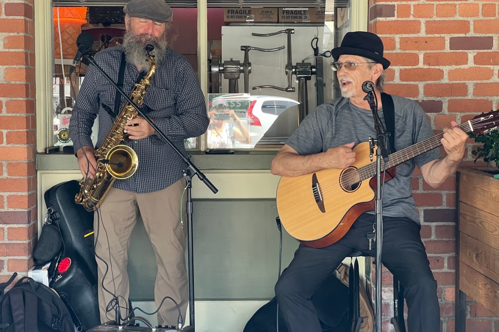 Ils sont deux musiciens a jouer sous le porche de la promenade de la rue principale dans Old Town Sacramento. On s’assoit sur un banc, on les écoute quelques minutes et on poursuit notre chemin.
