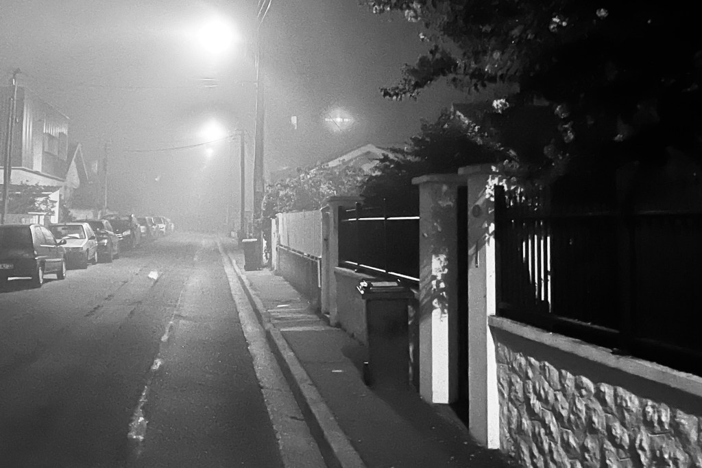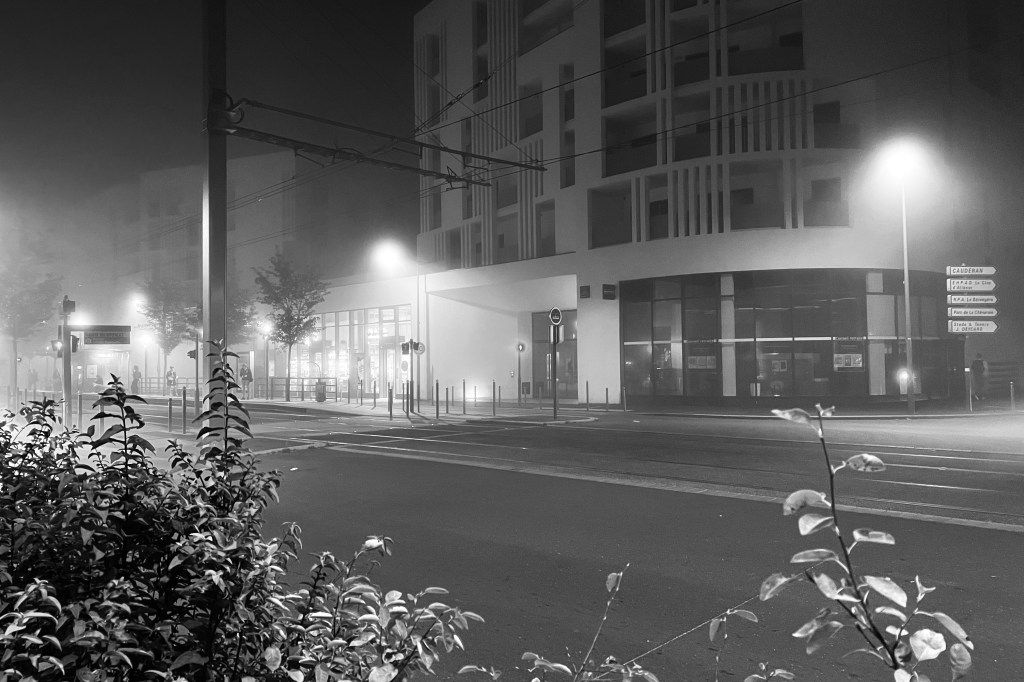 Le brouillard recouvre la ville, les trottoirs humides absorbent la faible lueur des réverbères. Je ne croise personne dans les rues. Les trois portes-fenêtre du numéro 12 de la rue de la République sont bien fermées, aucune lumière à l’intérieur. Aucun signe du petit homme à la casquette blanche. Je note, ça fait deux matins de suite. Le tram D se détache au croisement des rues. C’est un modèle réduit, pas beaucoup de places. J’en trouve une dans le carré, en décalé de la jeune femme au JOT framboise. Ce matin, ses cheveux sont humides, quelques mèches tombent sur son front. Sourire toujours absent, visage fermé, elle a un sac à dos noir sur ses genoux, un petit sac kaki en bandoulière. Elle pianote sur son téléphone puis regarde inlassablement au-dehors. Autour de nous, des personnes toussent.