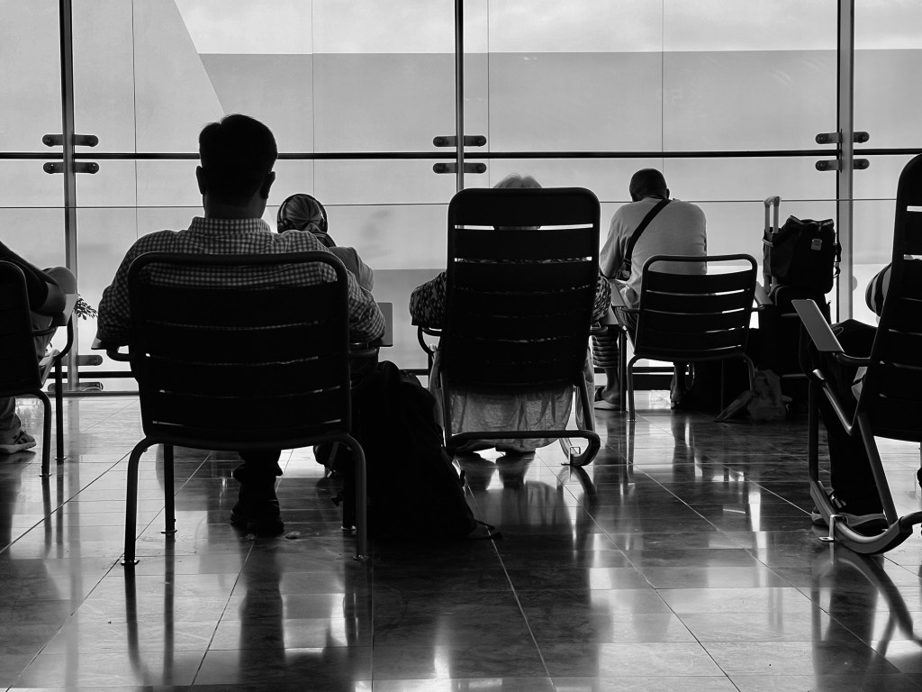 Ça commence souvent par un lever trĂšs tĂŽt un voyage. Une nuit courte. Un avion Ă  prendre. Des correspondances Ă  rejoindre. C’est fait d’attente, de piĂ©tinements, de files d’attente au passage du filtre de police ou des formalitĂ©s aux douanes, d’errance au duty free. C’est aussi le flux constant des passagers aux regards embrumĂ©s parfois perdus croisĂ©s dans les couloirs de l’aĂ©roport. Certains arrivĂ©s la veille en zone de transit dorment sur des siĂšges mĂ©talliques, enroulĂ©s dans une veste ou Ă  mĂȘme la moquette.