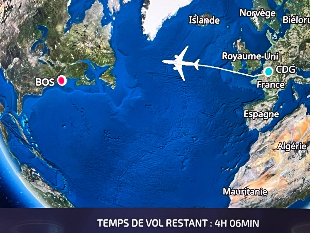 Au dĂ©collage, la tour Montparnasse et la Tour Eiffel sur la gauche de l’appareil. Le ciel est encombrĂ©, plusieurs avions filent Ă  des altitudes diffĂ©rentes. Le plafond est bas. L’avion fend la couche nuageuse, quelques turbulences et l’altitude de croisiĂšre est atteinte Ă  plus de 12 000 mĂštres. L’écran affiche une vitesse de 890 km/h et une tempĂ©rature de -50 degrĂ©s Celsius.