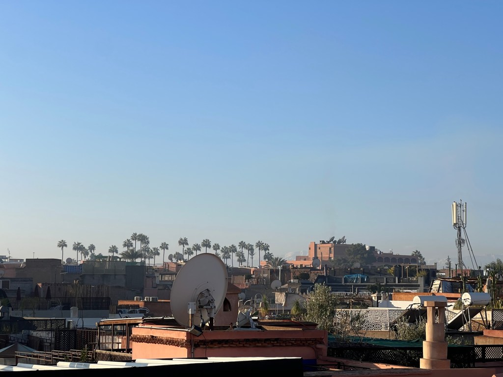 Assise Ă la terrasse du riad, face au levant, Ă©blouie, tel Meursault sur la plage, par les rayons du soleil, je savoure les derniers instants dans le calme, le regard flottant sur les toits de la mĂ©dina. Les bruits de la vieille citĂ© mâarrivent en sourdine, les oiseaux chantent et au lointain un avion dĂ©colle. BientĂŽt ce sera le nĂŽtre.