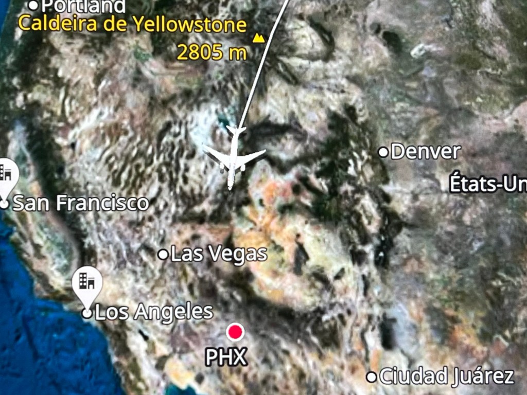 InstallĂ©e sur un siĂšge de la rangĂ©e centrale, je nâai rien vu du survol de lâEcosse, de lâIslande, du Groenland, puis de la courbe effectuĂ©e par lâAirbus A350 pour traverser une partie du Canada avant dâobliquer sud vers PhĆnix. Seul lâĂ©cran incrustĂ© dans le dossier du siĂšge devant moi mâa permis entre deux films de me rendre compte du trajet parcouru grĂące aux camĂ©ras extĂ©rieures de lâavion. Une sorte de voyage virtuel en prĂ©sentiel.