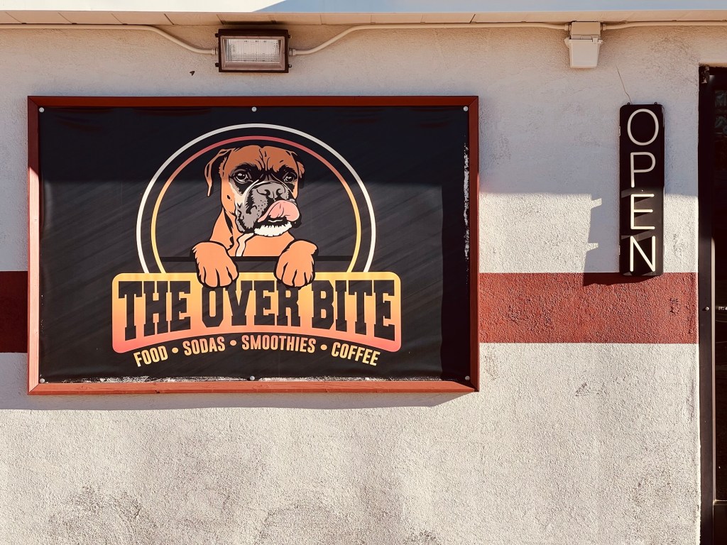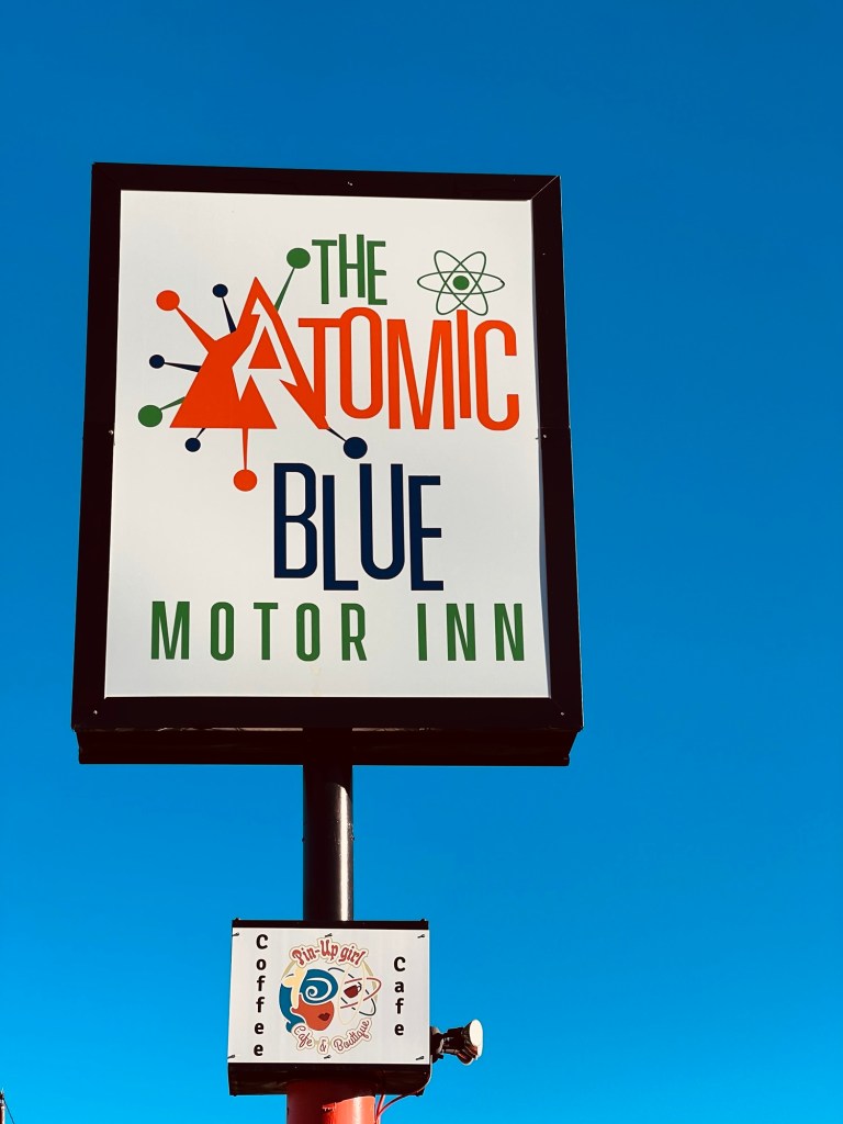 Le ciel est dâun bleu magnifique lorsque nous quittons la chambre 119 du Motel The Atomic Blue pour prendre un breakfast au The Over Bite.