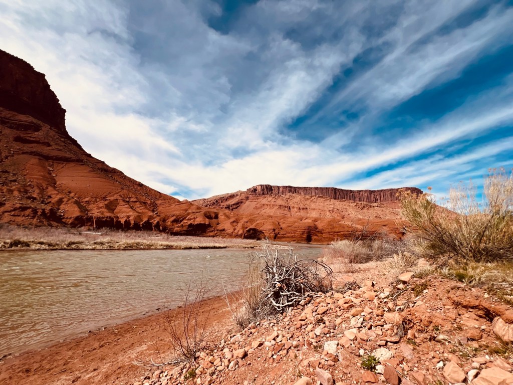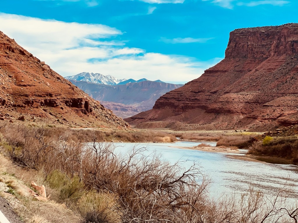 Nous passons de lâautre cĂŽtĂ© du massif montagneux et dĂ©couvrons Castle Valley baignant dans sa terre rouge, traversĂ©e par les eaux vertes de la Colorado River.
