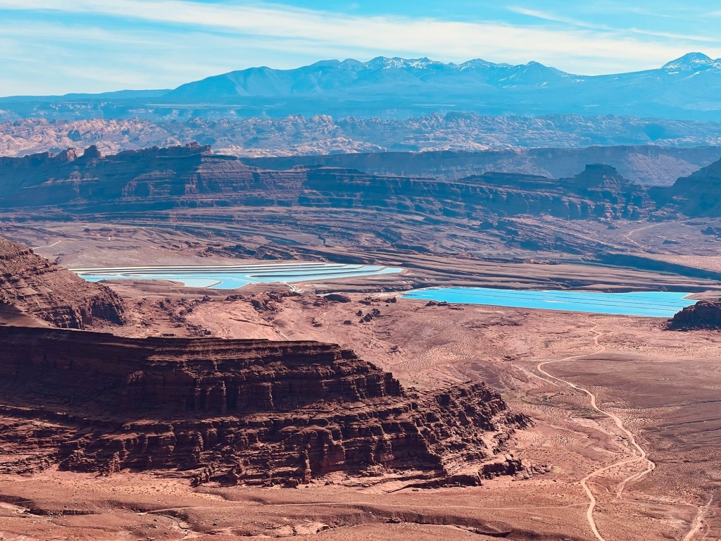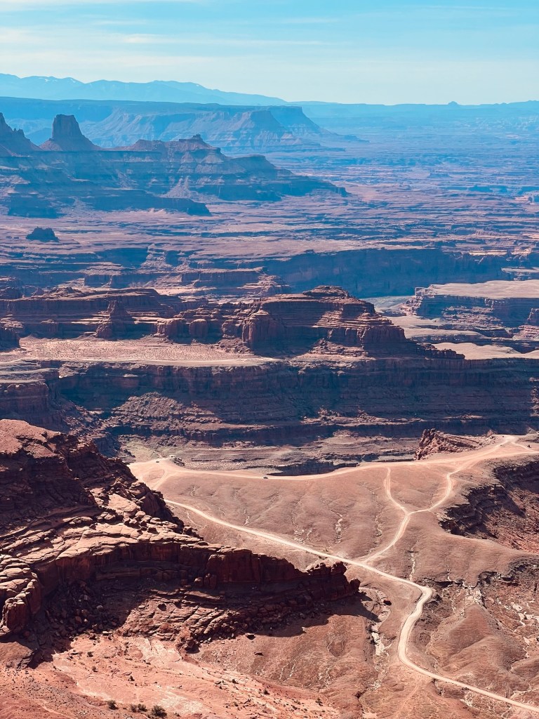 En bas, sur cet autre plateau, la piste en terre trace sa route dans ce paysage dĂ©sertique. Câest la piste que nous aurions dĂ» prendre hier si nous avions eu un vĂ©hicule plus appropriĂ©. On aperçoit les bassins de potasse, puis plus loin le Thelma et Louise Point. La piste se poursuit vers le Gooseneck et le Shefer Trail Road. Cette derniĂšre partie trĂšs impressionnante. Elle remonte Ă flanc de roche, dans le vide, sur une piste trĂšs Ă©troite oĂč les 4×4 peinent Ă se croiser et attendent souvent au dĂ©tour dâune courbe que lâun dâeux passe. Nous les avons suivis de notre point dâobservation, tels de minuscules fourmis.