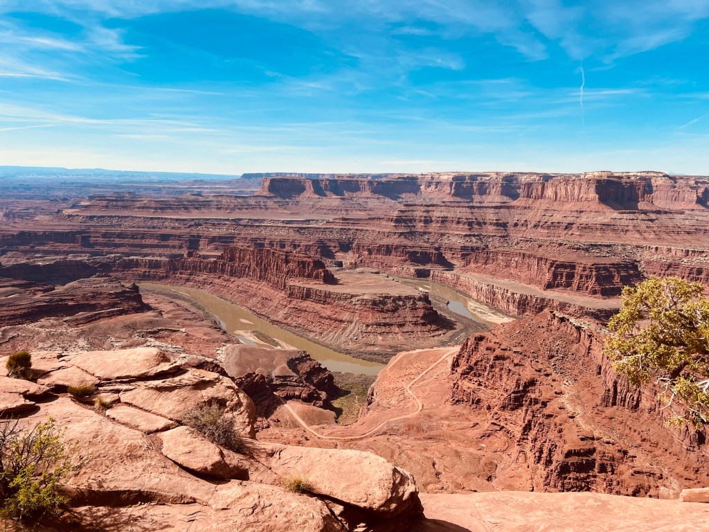 La fatigue commence Ă se faire un peu sentir. Nous ne sommes pas partis de bonne heure ce matin alors que nous avons au programme Dead Horse Point et Canyonlands North. Nous prenons la route UT-191 au nord de Moab et bifurquons Ouest aprĂšs lâentrĂ©e des Arches sur lâI-70 avant de prendre la direction de la Dead Horse Mesa Scenic Road (313). Le ciel est voilĂ© ce matin et la tempĂ©rature va encore monter, jusquâĂ 30âąC.