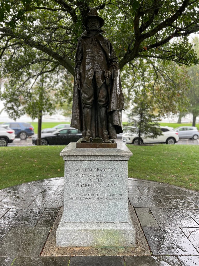 En approche de Plymouth, les gros nuages menaçants se percent et ce sont des trombes d’eau qui se déversent sur la ville au moment de notre entrée dans la partie historique où la centaine de colons anglais ont débarqué. Nous ne verrons que la statue de William Bradfort, l’un des Pilgrim Father, le célèbre Plymouth Rock, symbole de l’emplacement de la création de la Nouvelle Angleterre, et la réplique du Mayflower II accosté au ponton.