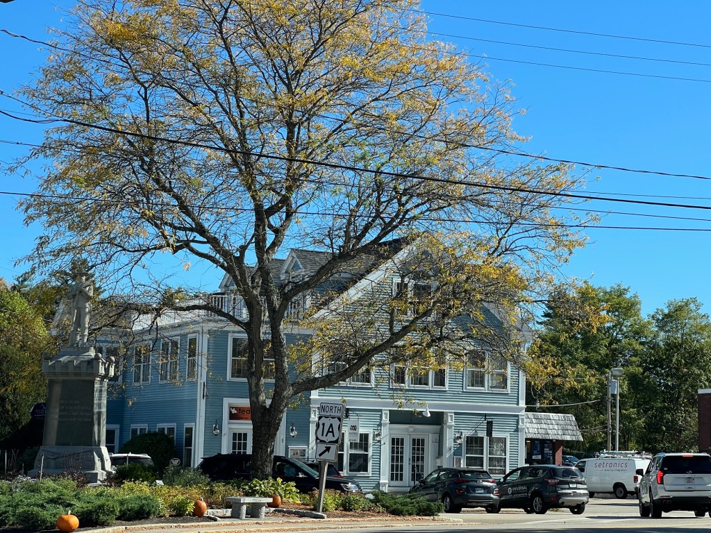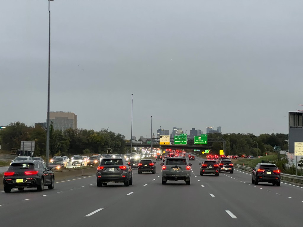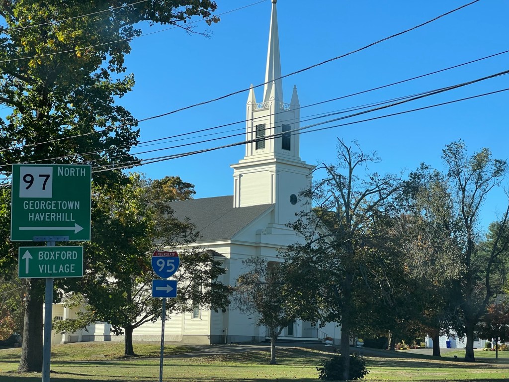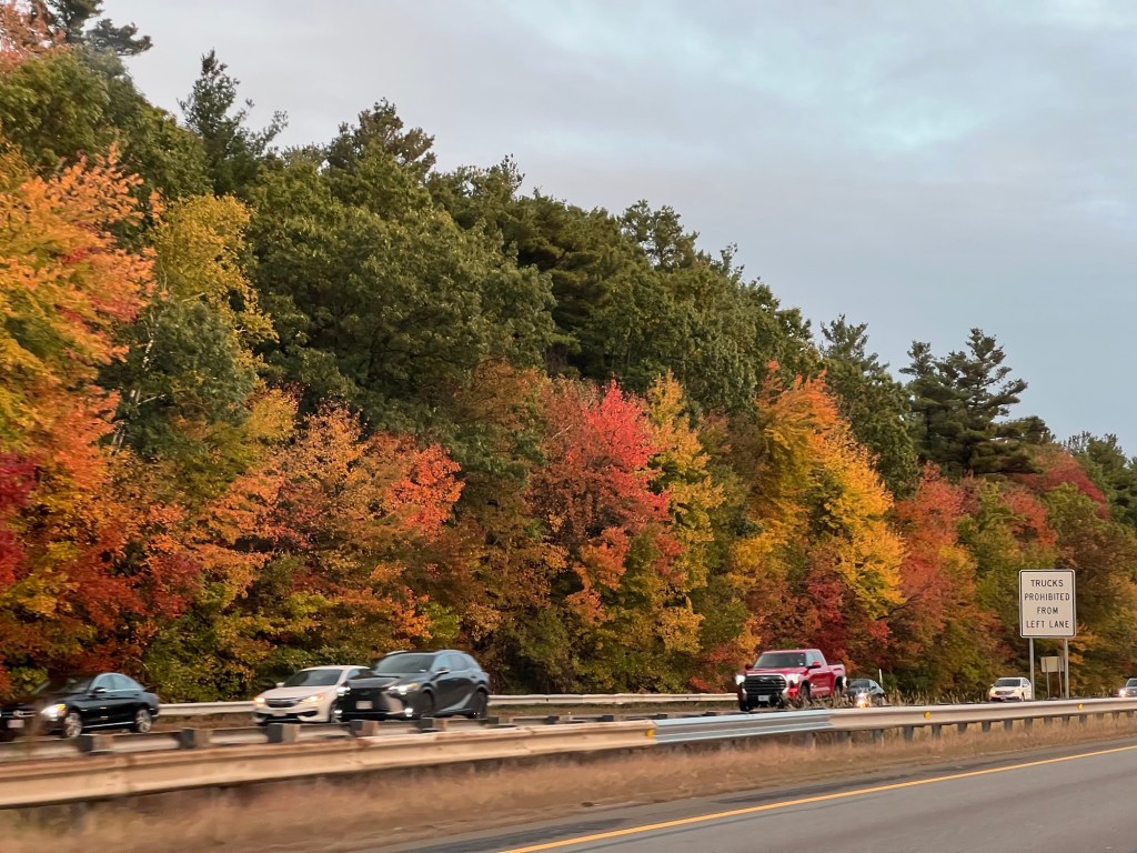 À 30mn de Boston, nous quittons l’état du New Hampshire pour revenir dans le Massachusetts. J’ai encore loupé la photo du panneau de changement d’état. La circulation devient plus dense, mais nous pouvons toujours rouler à 65 mph. Les ralentissements viendront plus tard. Le soleil se couche et pare le feuillage d’une lumière dorée qui souligne les dégradés de jaune, orange et rouge. Ici, le foliage est moins avancé que dans le nord du pays.