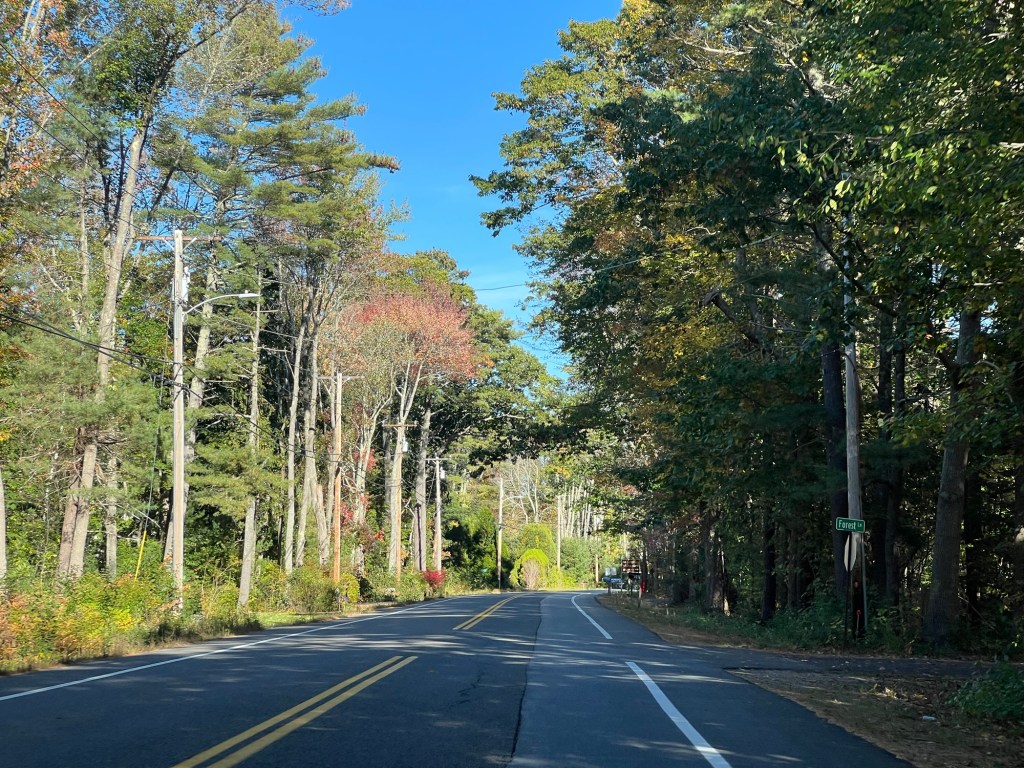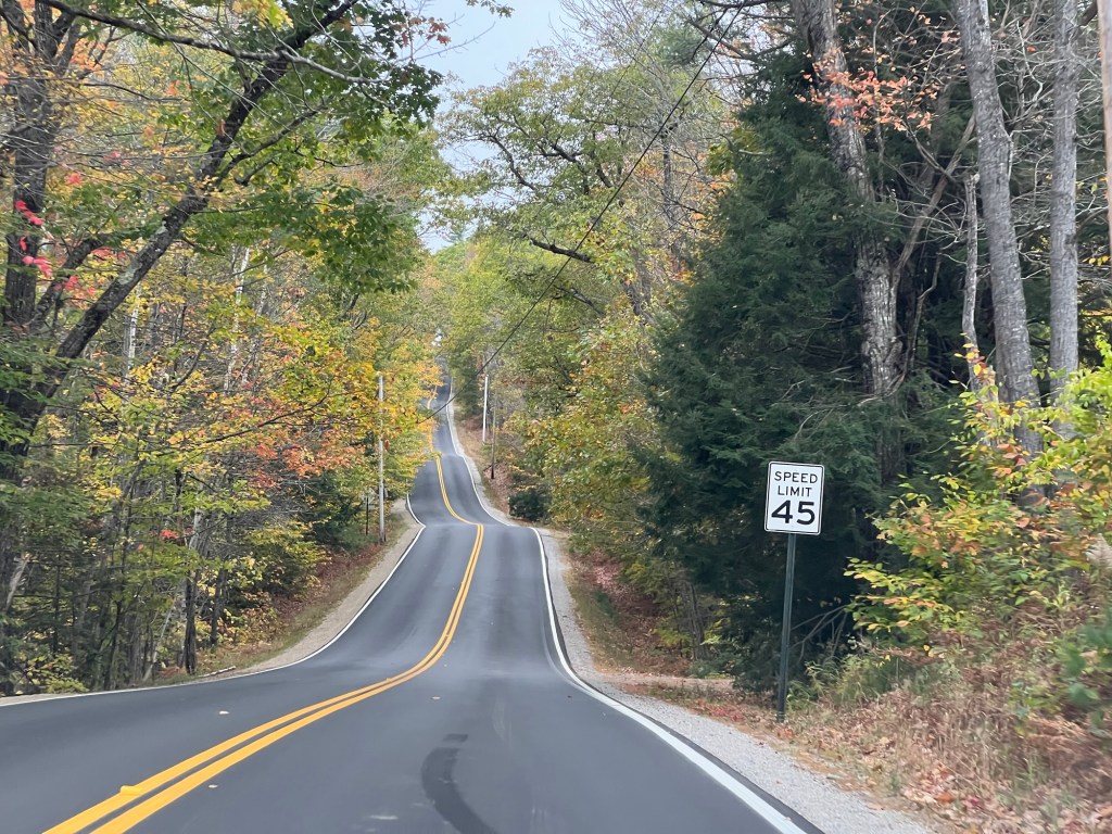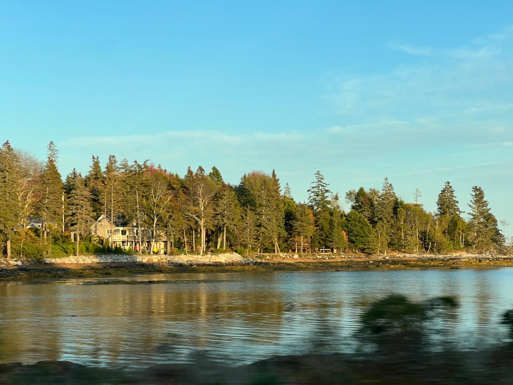 1h50 de conduite est programmée pour rejoindre Bar Harbor en suivant la route 1 jusqu’à Ellsworth puis la route côtière. Le ciel est voilé, mais le soleil tente de percer. La température monte un peu. La route 1 est plaisante. Elle sillonne la forêt et traverse différents villages aux différentes ambiances. Maisons en bois, jardins verdoyants, océan et monts arborés. Ici une préparation de flea market, plus loin les gens font la queue pour déguster un brunch bien mérité. Le paysage vallonné surplombe l’océan encore pris dans une brume matinale. On longe des lacs aux eaux profondes. Selon les différents Fall Foliage Reports consultés, le Maine atteindrait le pick de couleur. Je regarde la forêt et détecte peu de feuillages rougissants, mais certaines parties du parcours s’en rapprochent. Je prends quelques photos.