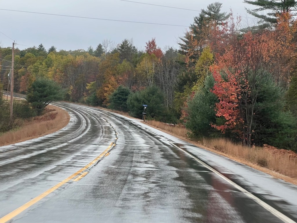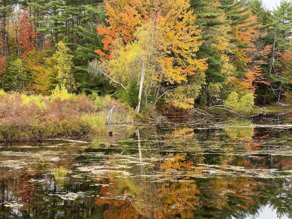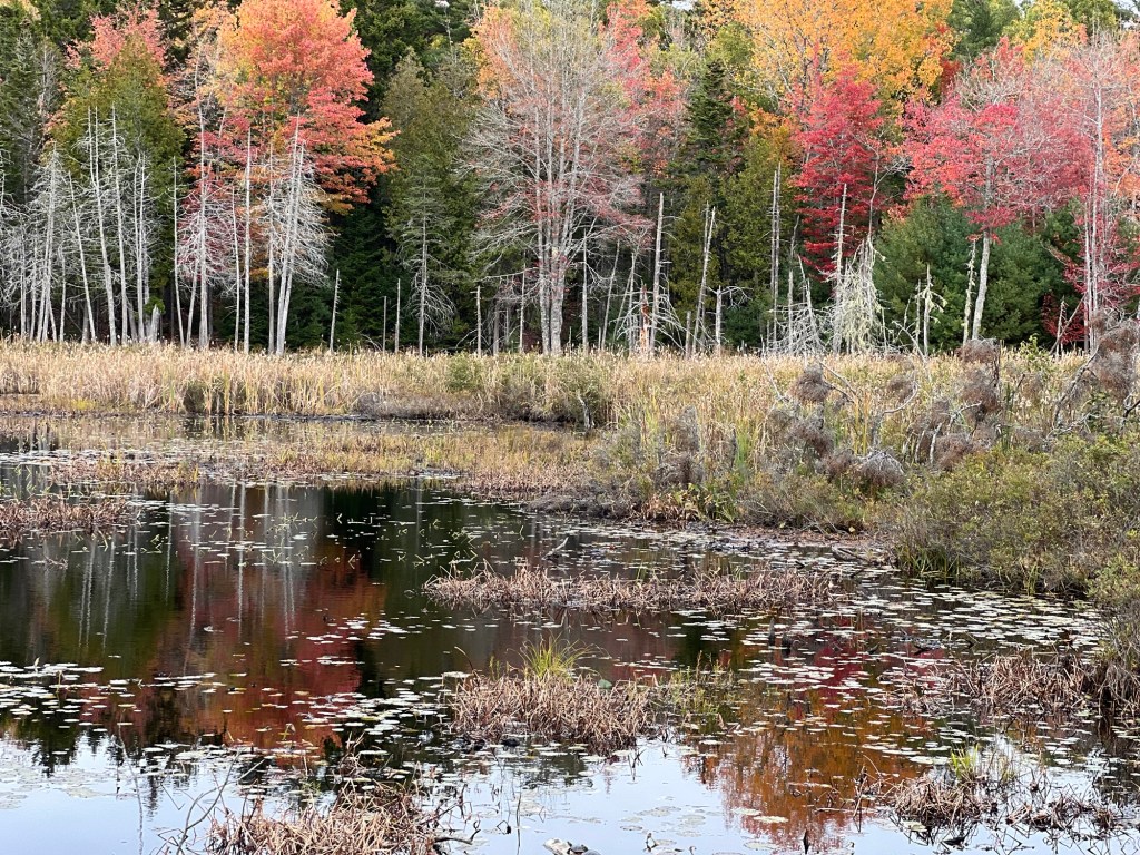 On traverse des paysages de forêts et de marécages. Le foliage (feuillage d’automne) ne semble pas tout à fait au rendez-vous bien que de nombreux arbres soient déjà bien dépouillés. Comme si une étape manquait. L’été chaud, trop chaud peut-être aurait-il eu raison de leur parure, ou est-ce déjà terminé ? Étonnant.