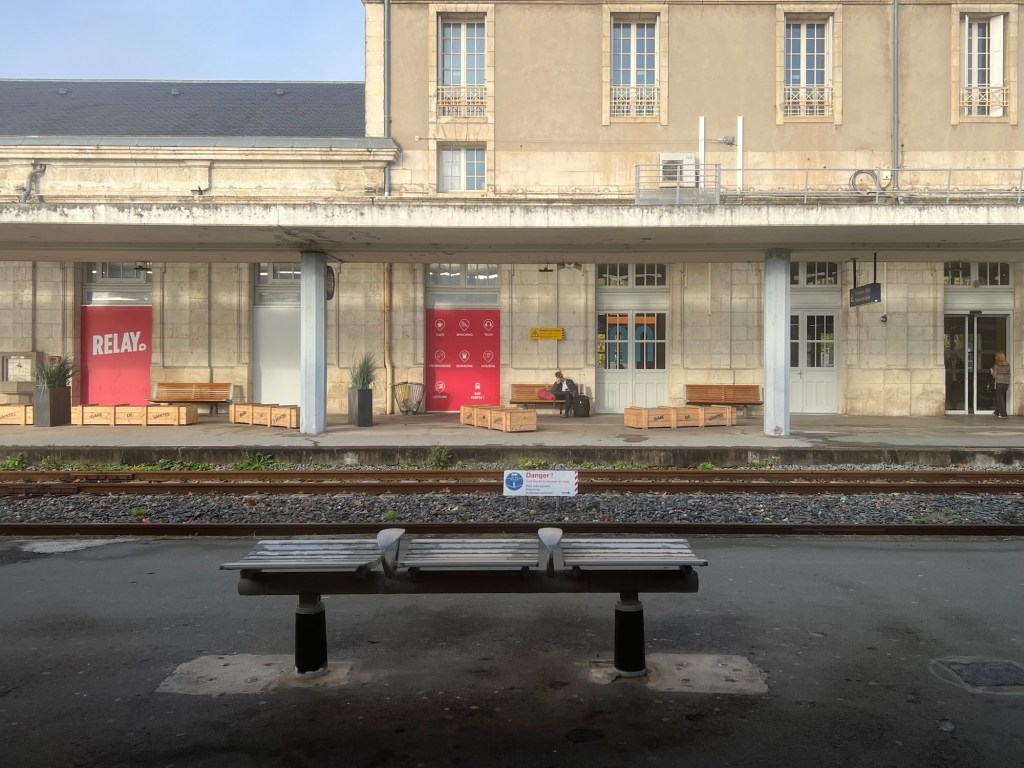 Jonzac|Saintes ~ Le réseau ne fonctionne pas bien, je capte moins, je perds des « barres ». Je tente le wifi intercités de la SNCF. Le train avance lentement, traverse des villages des hameaux. Au bord de la voie, veillent encore des maisons de garde-barrière désaffectées. Ici et là , des regroupements de bouleaux déjà dénudés. Un cimetière posé au milieu des champs, son mur d’enceinte matérialisant la limite entre les deux. À l’extrémité d’un champ, une rangée de ruches. On imagine les petites locataires s’affairant avant la période hivernale. À Saintes, cinq nouveaux voyageurs s’installent dans la voiture 2.