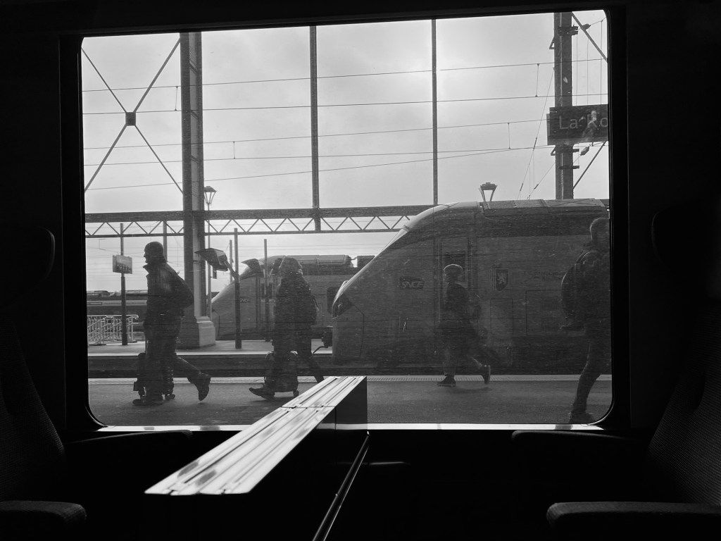 La Rochelle|Luçon ~ Au loin un clocher, des éoliennes, la campagne plate, en attente de l’hiver à venir. À côté de moi, la jeune femme passe des appels téléphoniques. Avec les écouteurs dans mes oreilles, je ne saisis pas la teneur de ses propos, professionnels il semblerait. Devant elle, un ordinateur HP, un bloc de prise de notes et deux portables. Je crois reconnaître des IPhone. Elle pianote sur l’écran, tousse, s’agace, hoche la tête, souffle. J’enlève le mode « pause » de mon film.