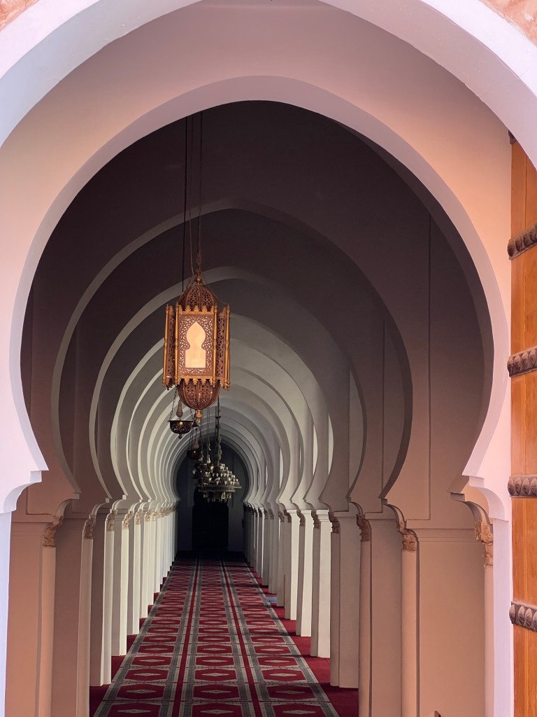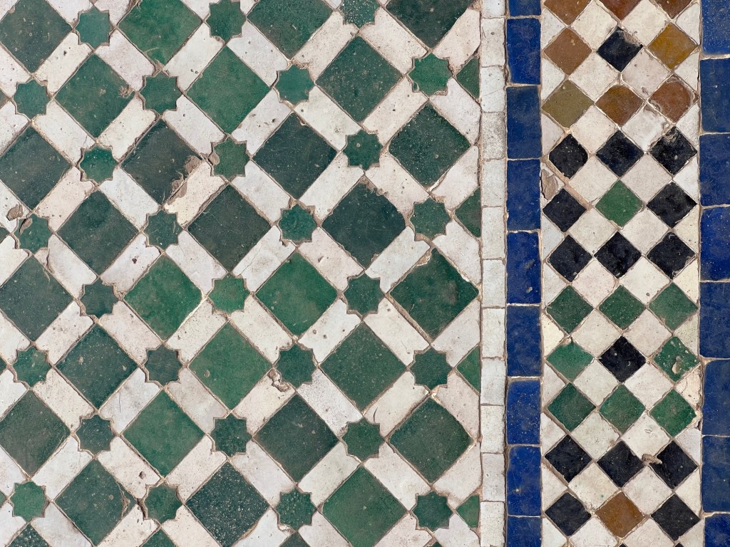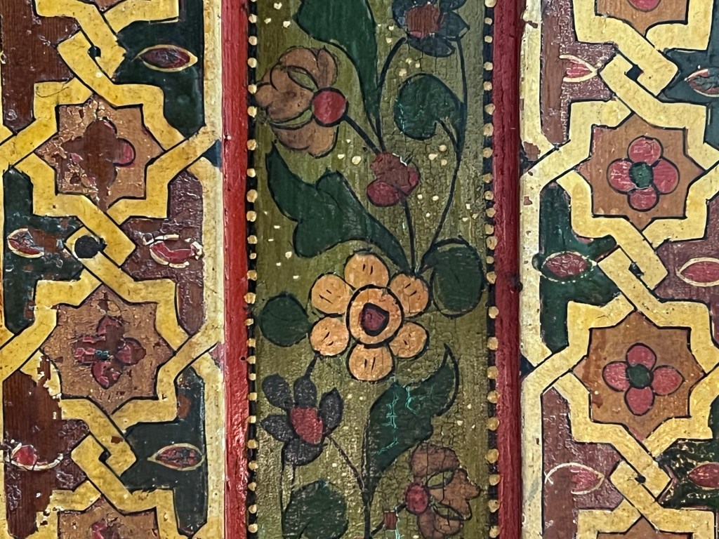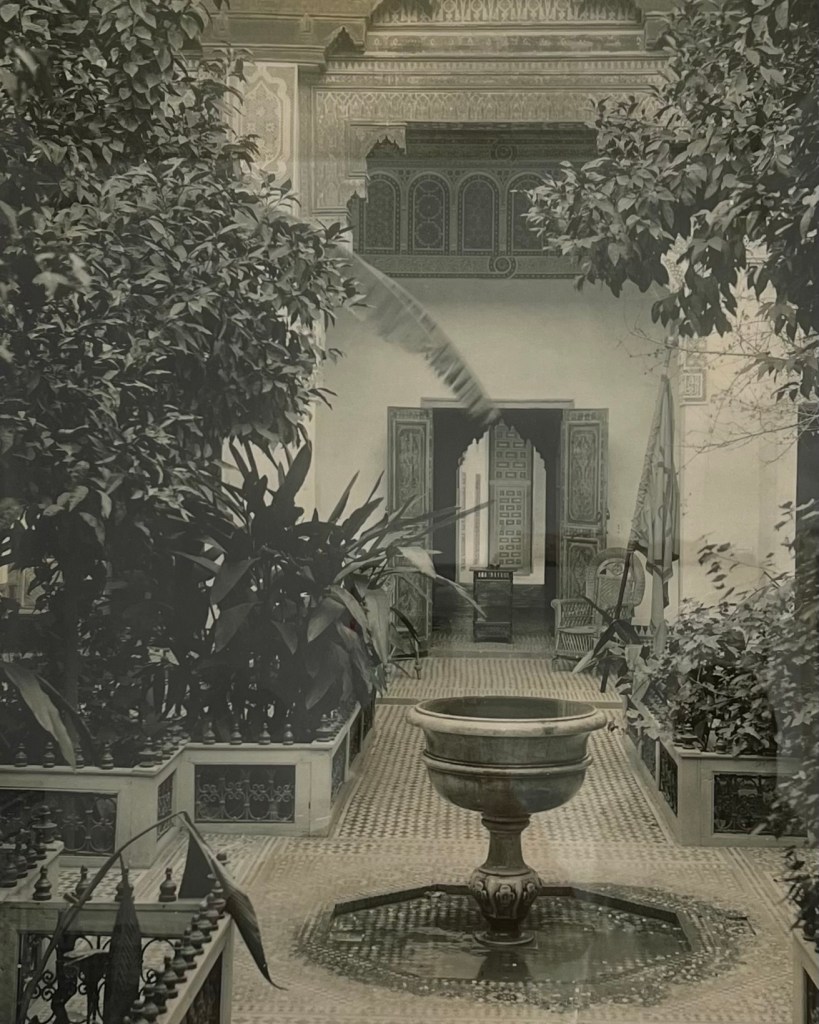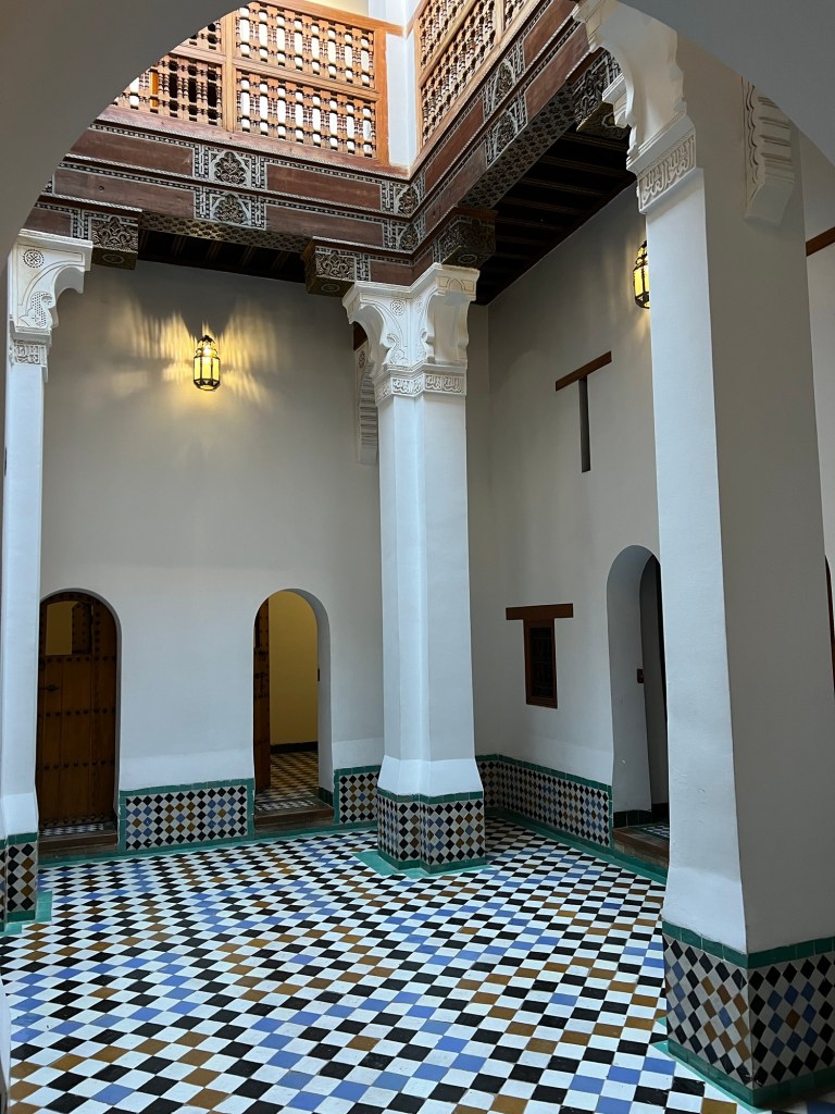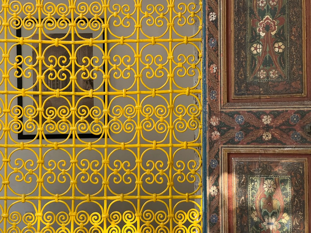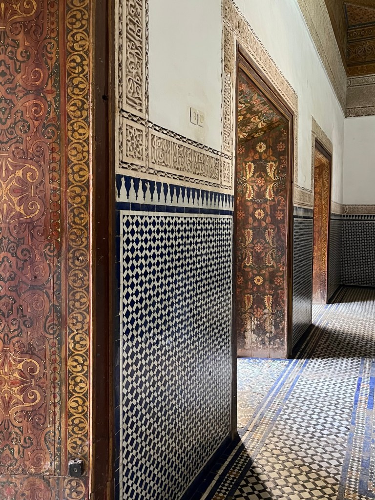 Zellige traditionnel, vitraux, sculptures sur bois de cèdre, peinture sur bois, du sol au plafond en passant par les murs, tout est délicatesse et ravissement pour le regard. On imagine les pièces aménagées de canapés drapés de tissus brodés, recouverts de coussins soyeux, de tapis moelleux, des lampes à huiles odorantes, des oiseaux qui chantent et la vie qui s’écoule, douce et tranquille. Était-ce vraiment ça ? Je ne sais pas, mais j’aime à le penser.
