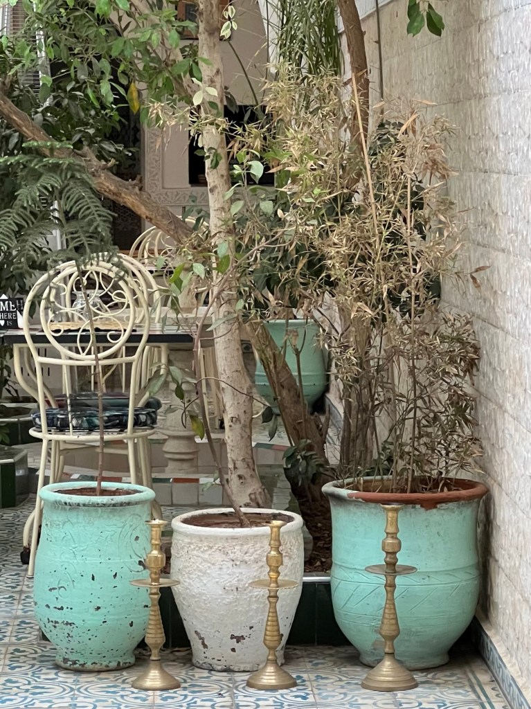 Et puis, nous marchons dans les ruelles étroites de Marrakech, nous traversons des carrefours embouteillés, des marchés, apercevons la gare routière, traversons deux grandes avenues et ainsi nous nous faufilons jusqu’au Jardin Majorelle. Une longue file d’attente nous attend. Nous discutons de tout et de rien. Nous présentons le QR code de nos billets achetés sur le site internet une heure avant. Nous rentrons enfin dans l’enceinte.