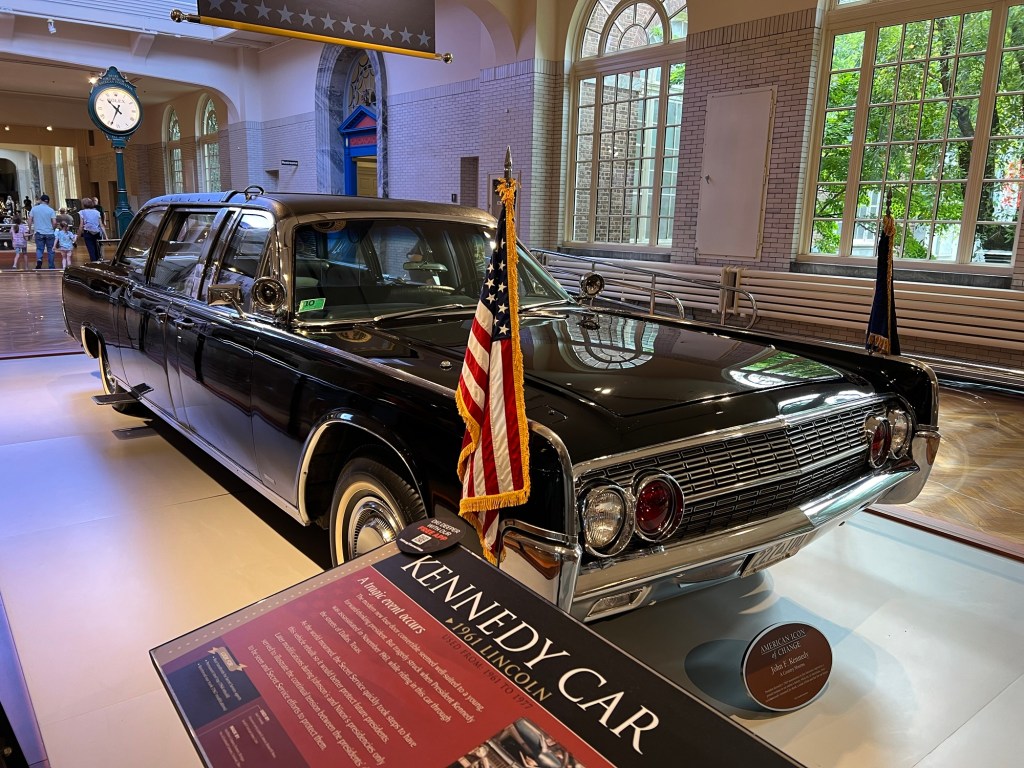Chambre 305. Départ pour Henry Ford Museum. Des hectares et des hectares dédiés à cette industrie automobile. À l’intérieur du bâtiment, on chemine entre les voitures présidentielles, les wagons de chemin de fer, les voitures de courses, de la célèbre Ford T aux modèles innovants. C’est aussi tout l’imaginaire de la route avec les motels, les drive-in, les diners, les pompes à essence, les accessoires de voyage – American Express Travelers Cheques , réveil de voyage – leur évolution à travers le temps.