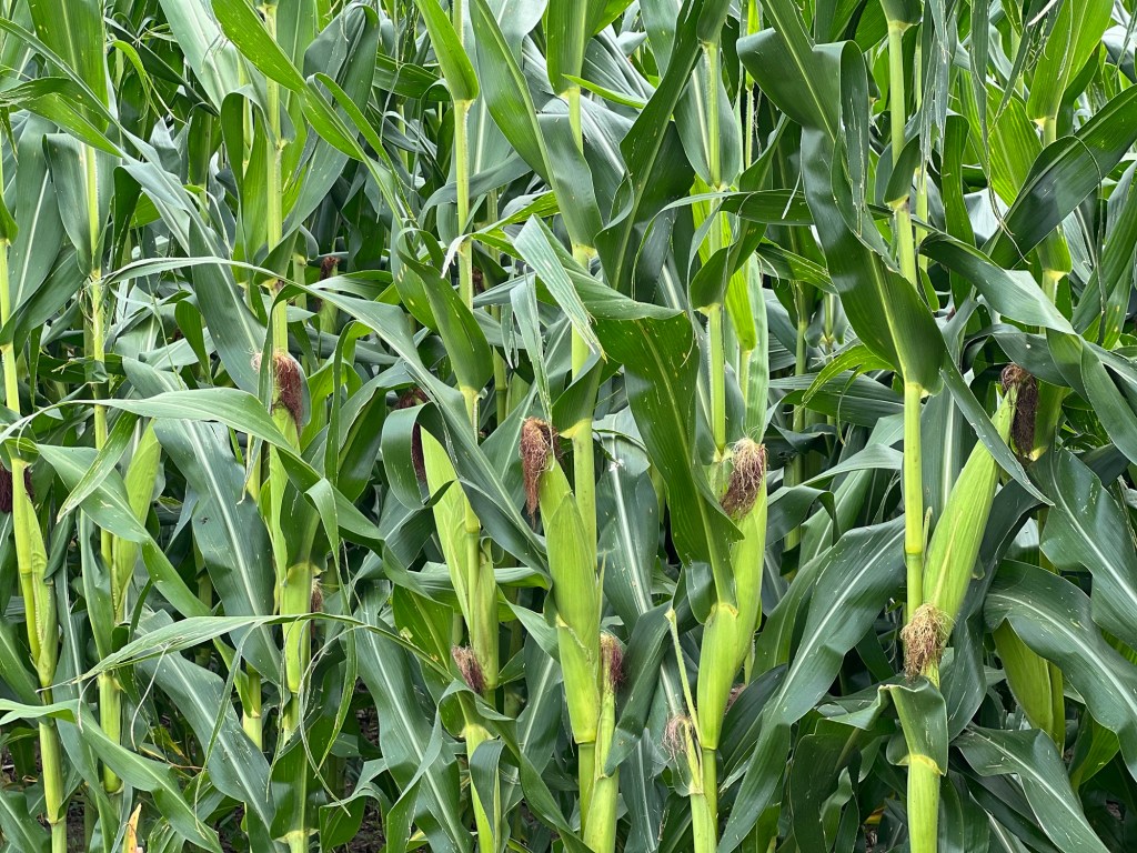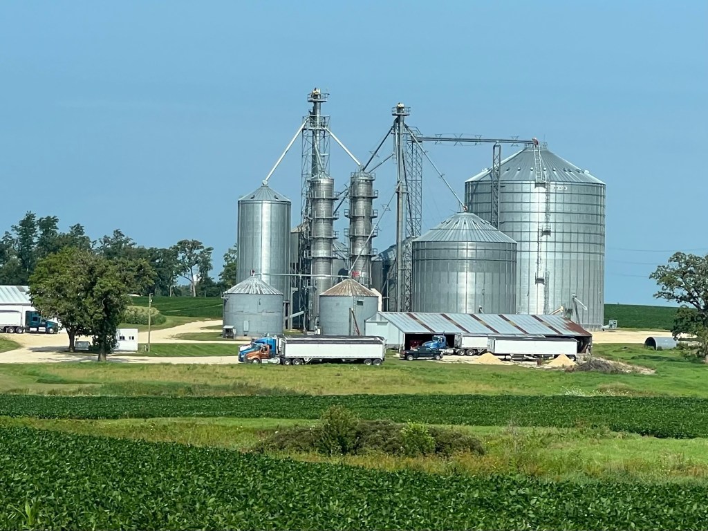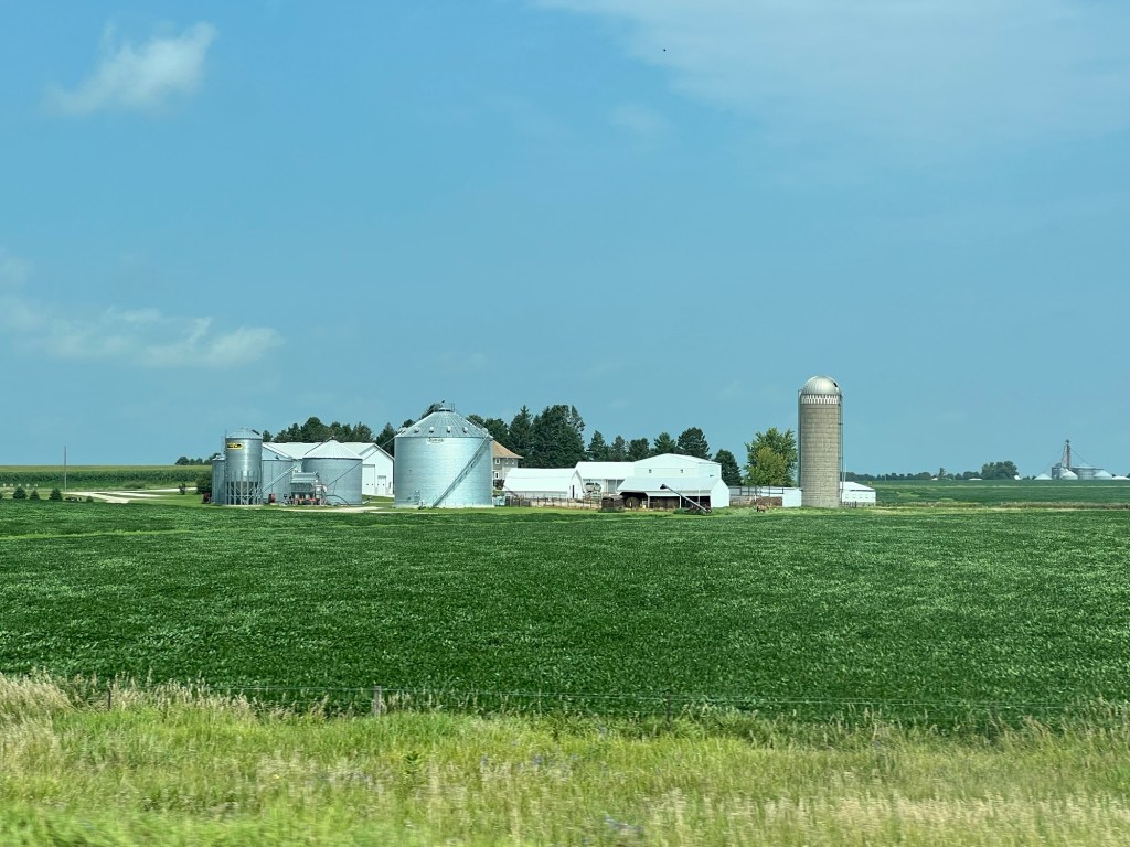 On roule maintenant sur une 4 voies, long ruban aux plaques claires entre champs de maïs à perte de vue. Les propriétés agricoles se succèdent les unes après les autres, tracteurs alignés, cours impeccable, maison en bois immense, jardin entretenu avec soin. L’herbe est même tondue autour des champs de maïs situés en bordure de route. Aucune âme en vue. Tout est calme, paisible.