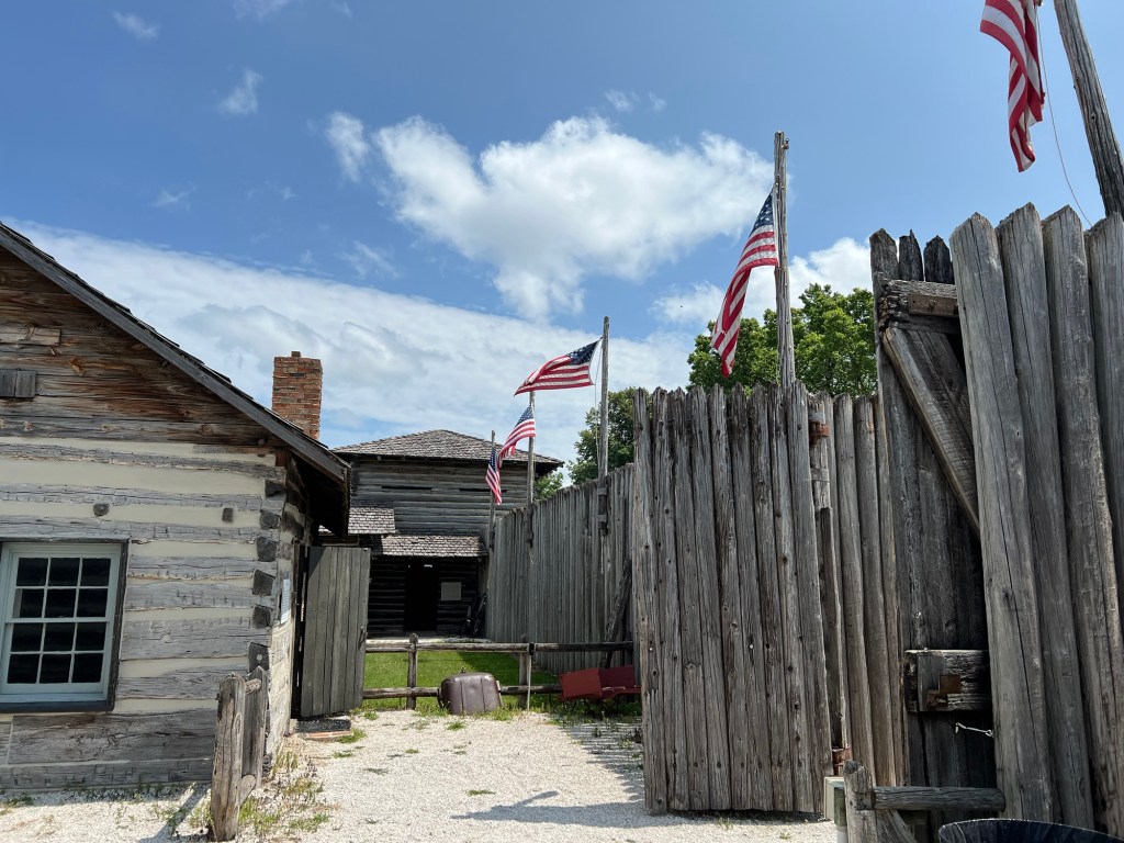 On rentre dans Elizabeth, 700 habitants. Traversée du village et ces photos qu’on a pas fait et qui nous trottent dans la tête. Visiter un fort construit en 1847, détruit et reconstruit à la fin du XXème siècle. Repartir en franchissant l’Apple River, petit cours d’eau ombragé.