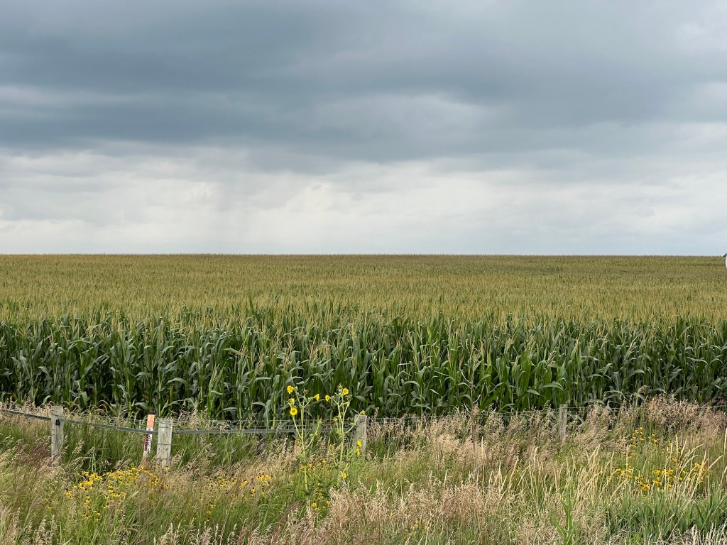 À 50 minutes de Sioux City, une forte pluie s’abat sur la vaste plaine. Dans la voiture, on ne s’entend plus. Au loin, à l’Ouest, des éclairs. Il est 16h et on se croirait à la tombée de la nuit. La température est tombée de 31 à 22 degrés en quelques minutes.