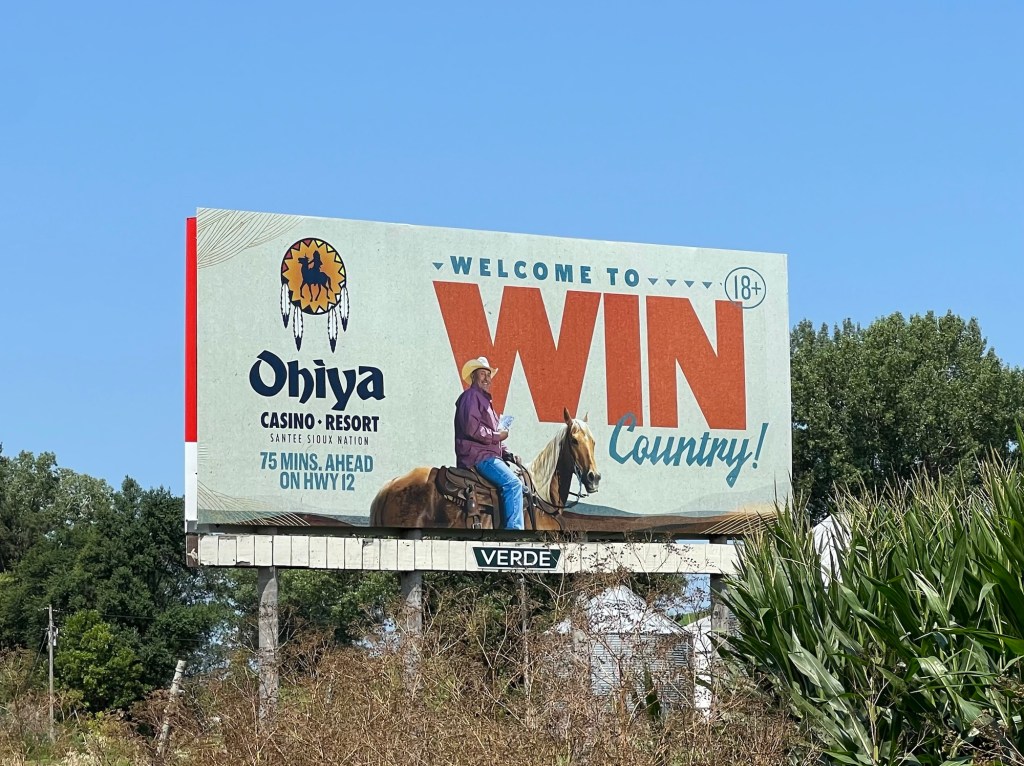 Quelques miles, changement d’état. Un casino sur la gauche et le panneau South Dakota sur le bas côté de la route, magnifique, et un peu plus loin celui qui indique l’entrée dans la réserve indienne de Rosebud. Devant, l’immensité de la prairie s’offre au regard avide de ces grands espaces tant de fois rêvés.