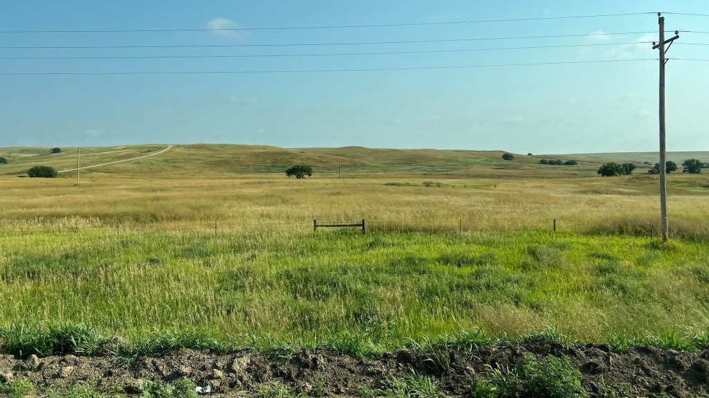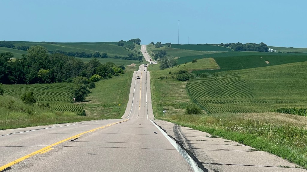 De l’autre côté de la Missouri River, des champs de maïs à perte de vue dans un paysage vallonné. La route monte et descend, sorte de montagnes russes naturelles. Et de temps à autre, la route égrainée de villages de quelques dizaines d’habitants, parfois plus.