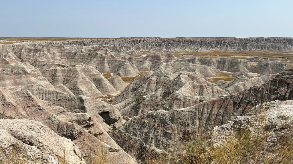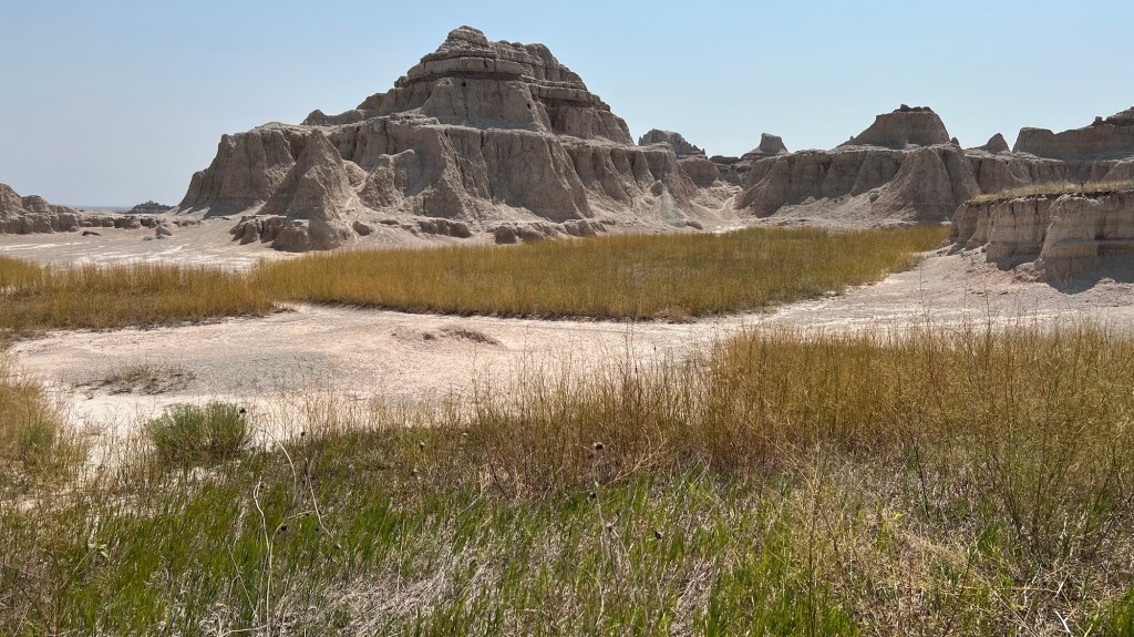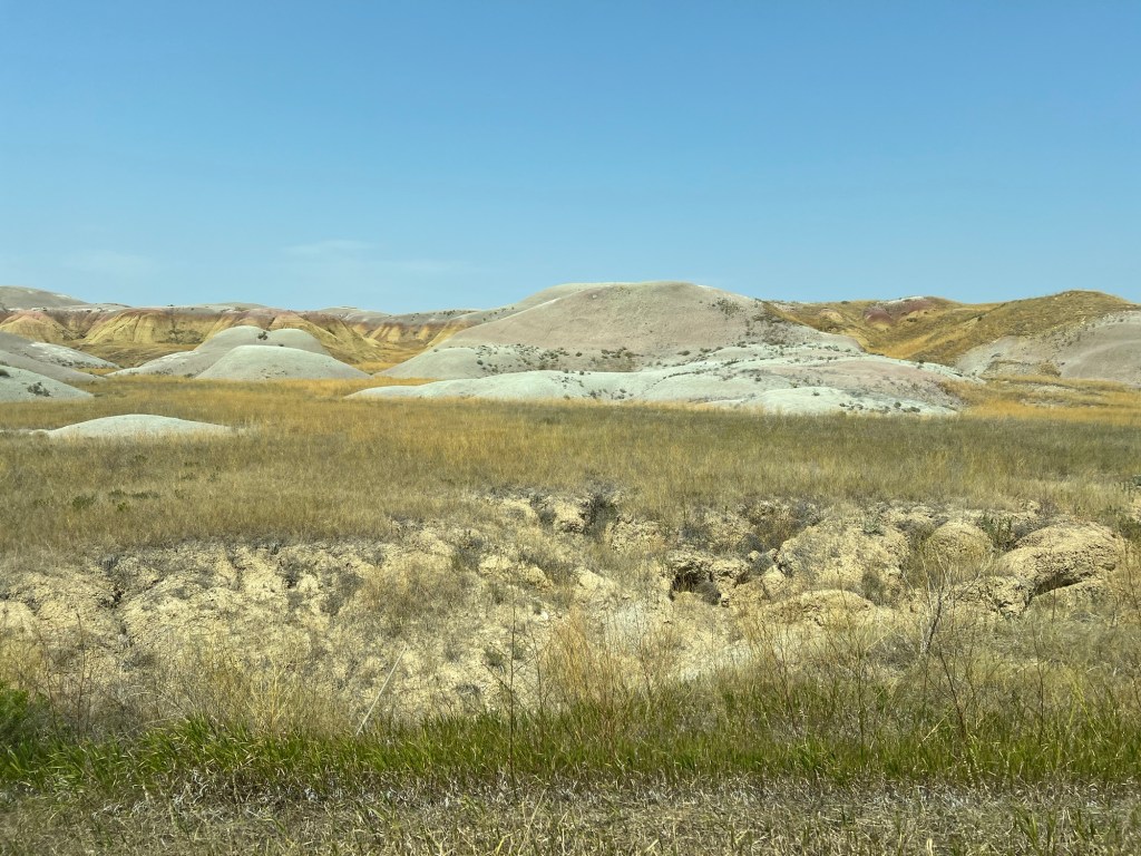 Elles sont là les Badlands. Le vent siffle dans les oreilles, caresse la prairie, cuit la peau, assèche les lèvres. Parfois une petite fleur jaune. S’arrêter sous une chaleur accablante approchant les 40 degrés pour admirer le paysage aux différents viewpoints.