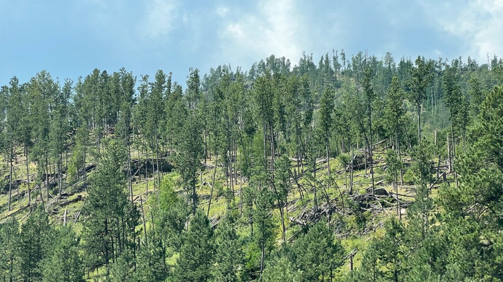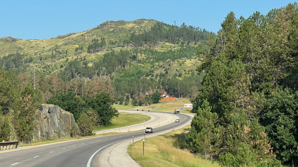 La route serpente entre les vallons recouverts par une forêt de pins. Bientôt nous découvrirons les portraits des premiers présidents des USA – Washington, Jefferson, Roosevelt et Lincoln.