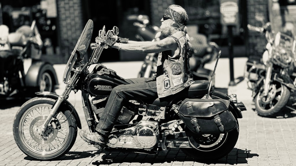 Incroyables ces bikers. Certains semblent aussi vieux que la marque de leur moto, barbe longue bien taillée, le visage buriné par le soleil, lunettes de soleil stylées, bandana sur la tête, teeshirt Harley sous un sans manche en cuir agrémenté de macarons à l’effigie d’Harley Davidson, bagues en argent, chaîne à la ceinture, jean long sur boots en cuir. Ils marchent dans la rue comme s’ils chevauchaient encore leur moto.