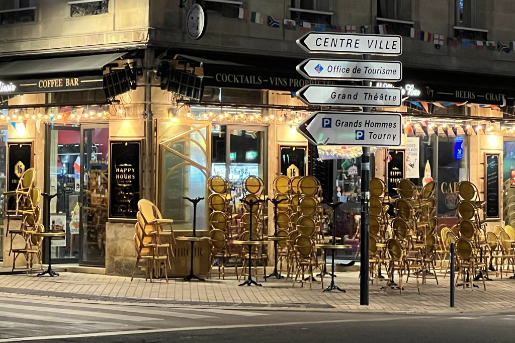 En sortant du tram place des Quinconces, je passe par la rue de Condé, des travaux de ravalement d’un immeuble de pierre, les ouvriers embauchent, montent sur l’échafaudage. Soudain, il pleut. Je me mets à l’abri sous un porche en attendant d’aller sur les quais pour prendre le bateau. La pluie s’intensifie. Les gouttes d’eau rebondissent sur la chaussée. La lumière des réverbères reflète bien le rideau humide. Les rares passants accélèrent le pas.